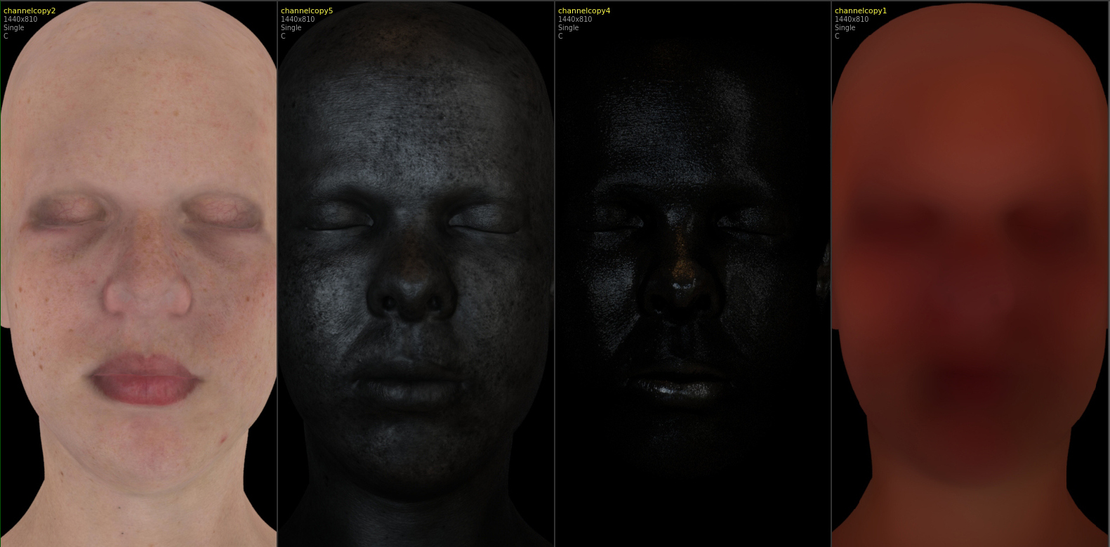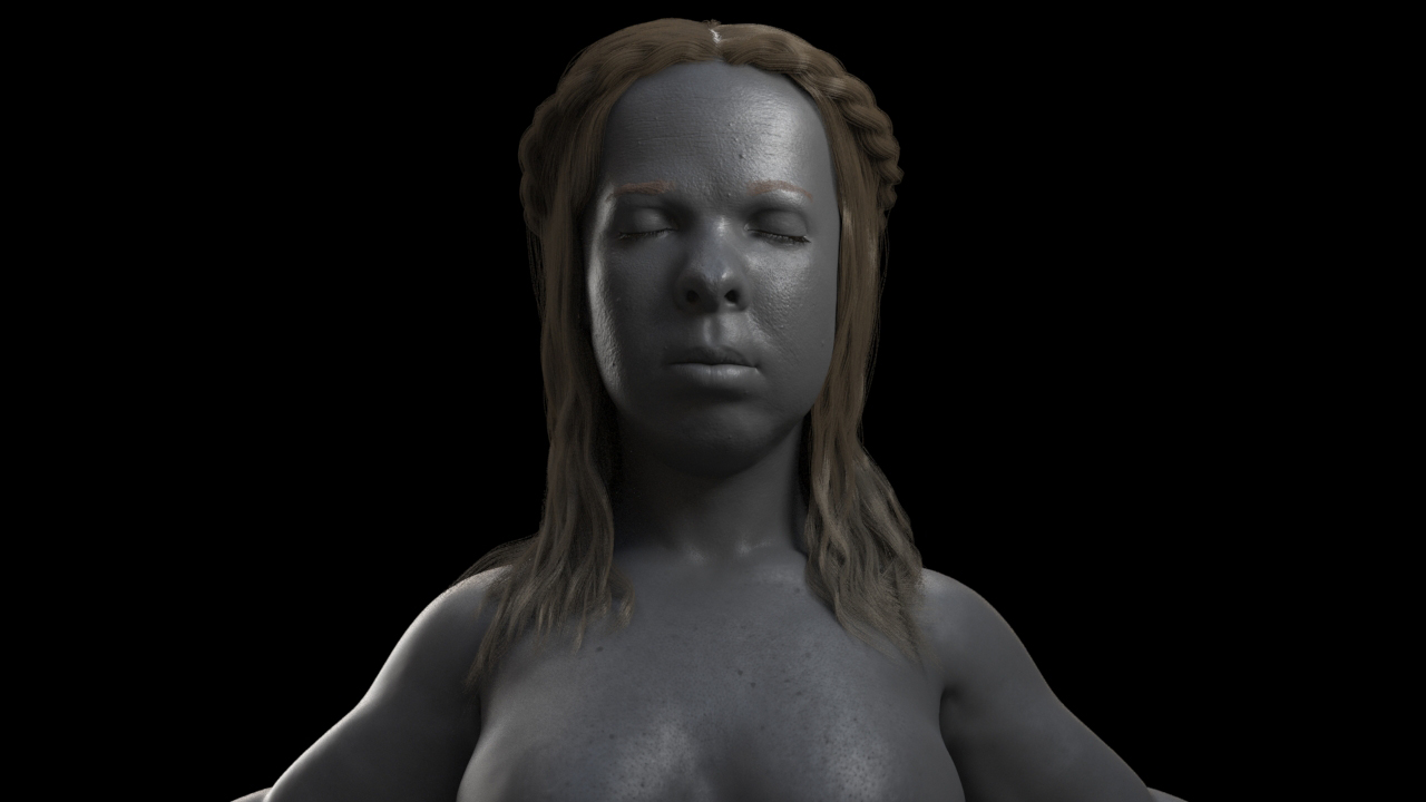 All of the displacement was hand sculpted in Zbrush. To allow for such detail the head and body were split into two object and then recombined in Houdini.
